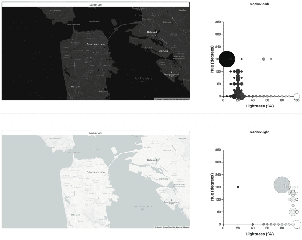 The blog post describes how Stamen approaches the design process for creating dark-mode cartography. The authors for example elaborate on the distinction of “night mode” (low contrast dark maps) and “daytime dark mode” (high contrast dark maps), treating them as subgenres within the category of dark-mode maps. The post illustrates the design principles and thinking that went into them using several examples of map styles from Stamen’s portfolio and others. Finally, the authors introduce an interesting scatterplot technique to analyse map color palettes by plotting pixel counts based on their hue and lightness values. These scatterplots can distinguish “shifting” vs. “mirroring” approaches to creating dark-mode maps.