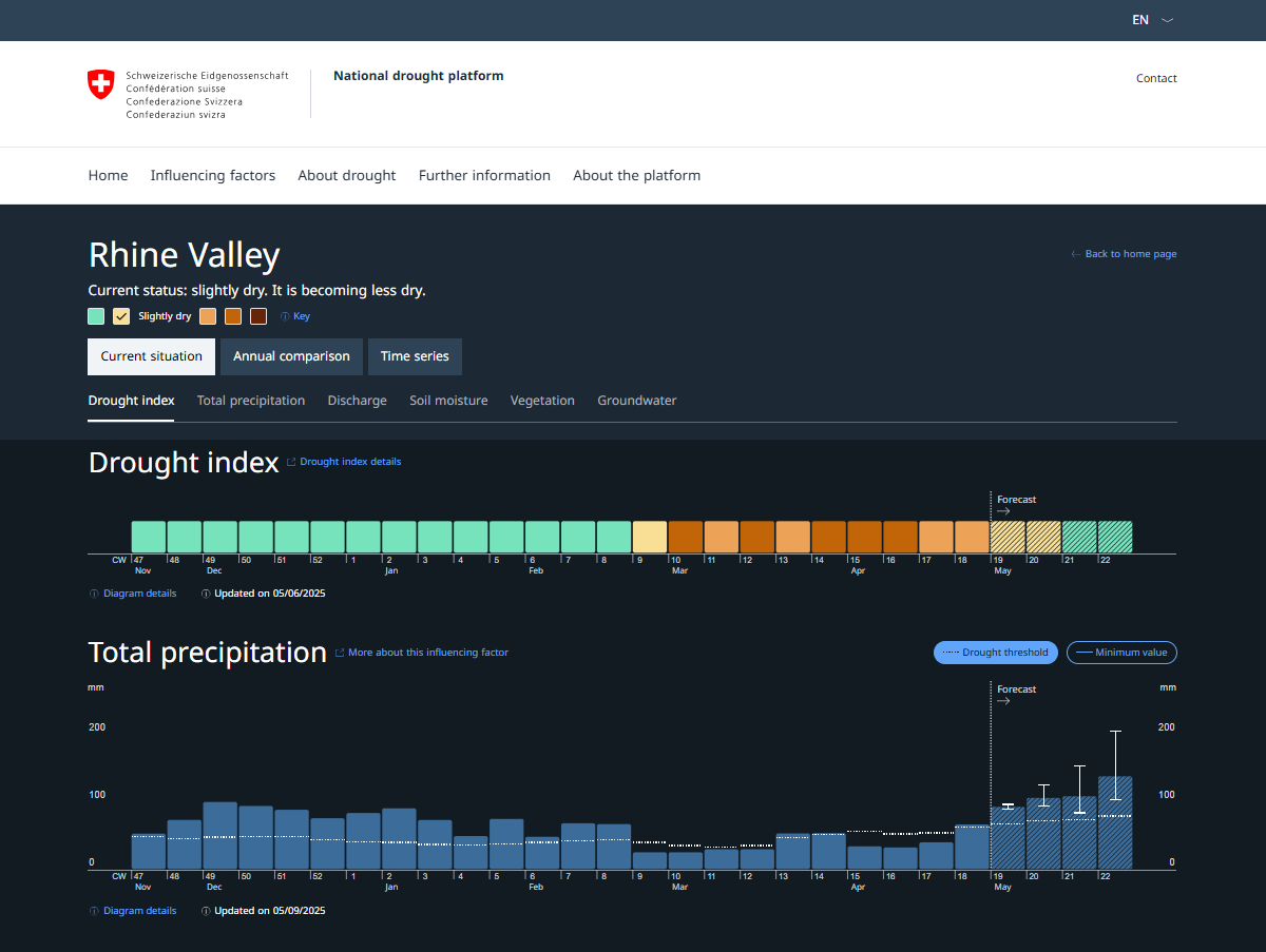 The drought platform provides standardized information on the current drought situation in the various regions of Switzerland as well as forecasts for the next four weeks. Data on past events can also be retrieved. Existing monitoring networks and forecasting models have been supplemented with new information based on satellite data and long-term forecasts, e.g. for precipitation. Measurement data on soil moisture and water temperatures is also expected to be integrated from 2026.