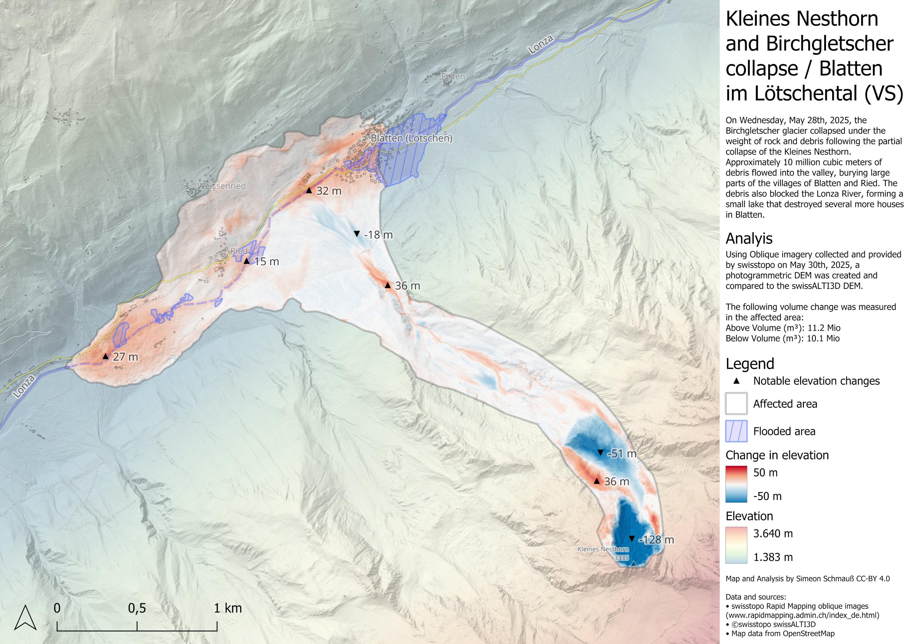 Simeon Schmauß has also created an annotated post-event 3D model from the Swisstopo Rapid Mapping data (see below). This one can be explored interactively on Sketchfab.