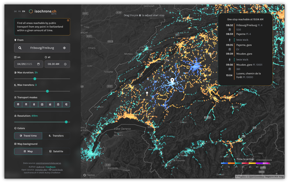 The Prix Carto recognition award was awarded to Aubry Cholleton for his web app “isochrone.ch”.
